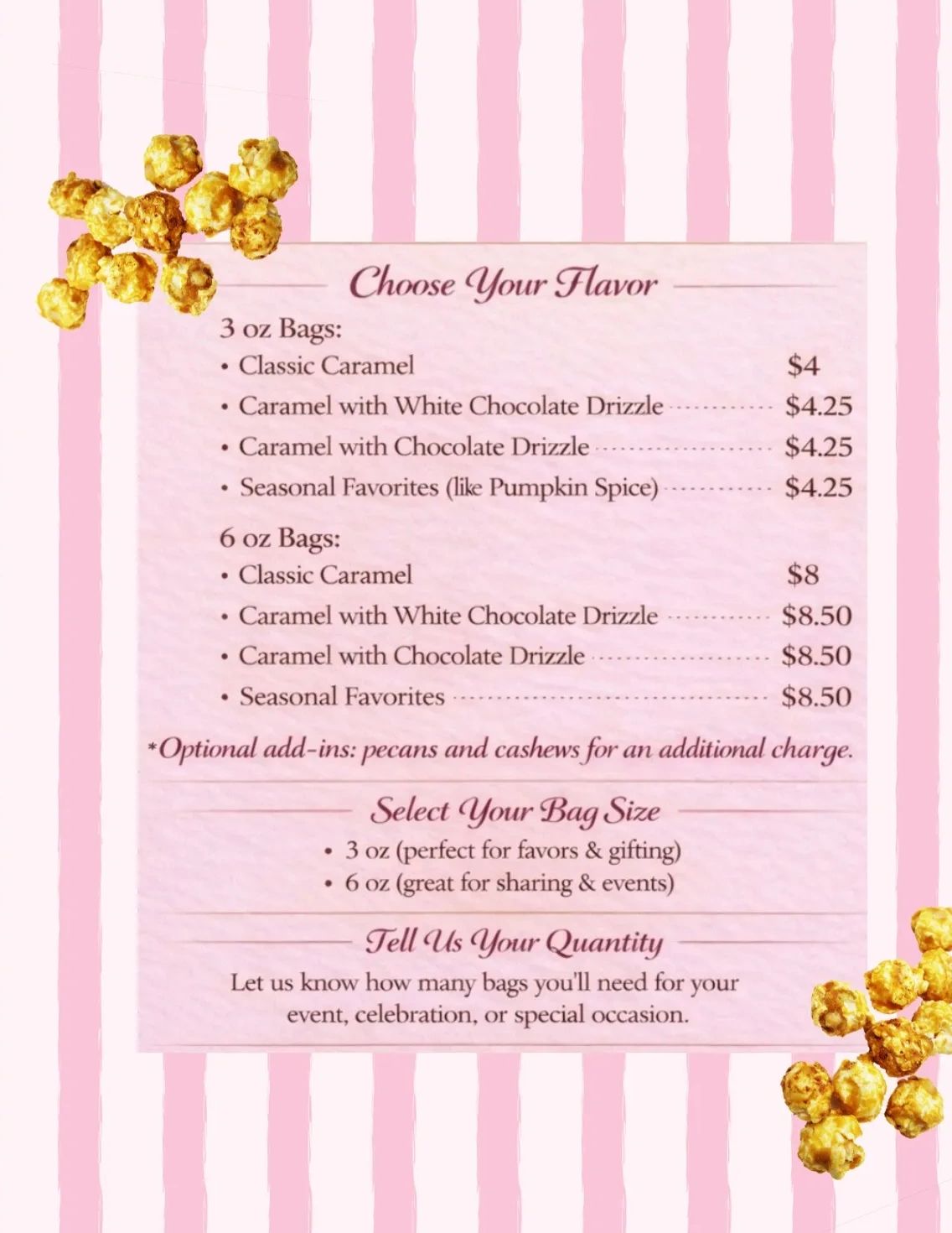 Our caramel popcorn favors are thoughtfully crafted in small batches using real ingredients—beautifully wrapped to match your wedding style. From custom labels to perfectly coordinated ribbons, every detail is designed to feel as special as your day.